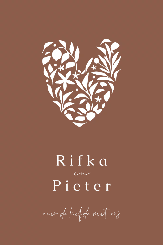 Roest trouwkaart met mooi bloemenhart hart van bloemen in goudfolie. Pas de kleuren, folie en gegevens eenvoudig aan in de handige editor!