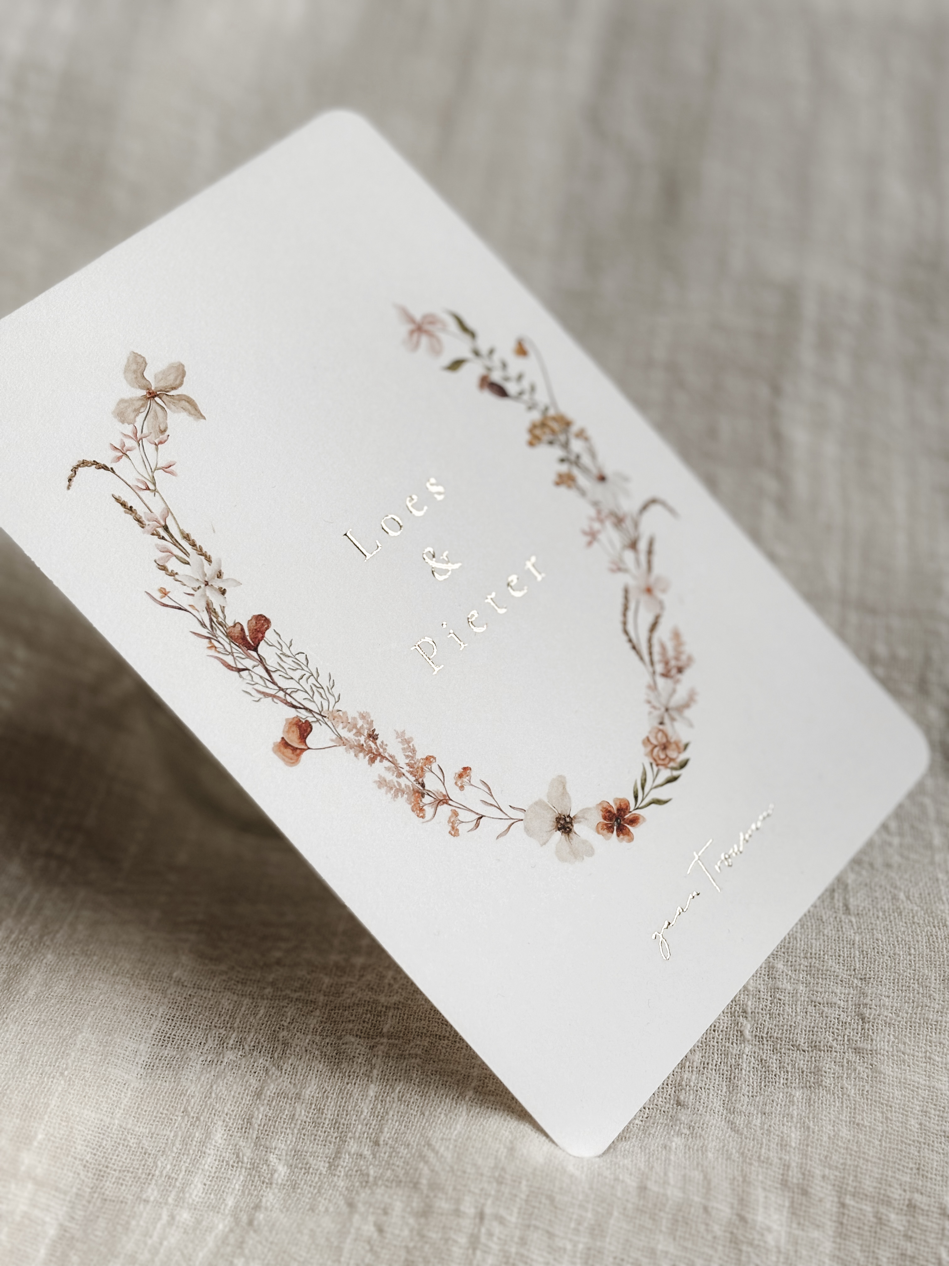 Chique mooie trouwkaart met aquarel wilde veldbloemen in een open ovaalkrans en afgewerkt met de namen in goudfolie. Pas de kleuren en gegevens gemakkelijk aan in de handige editor! Hulp nodig? Wij helpen je graag!