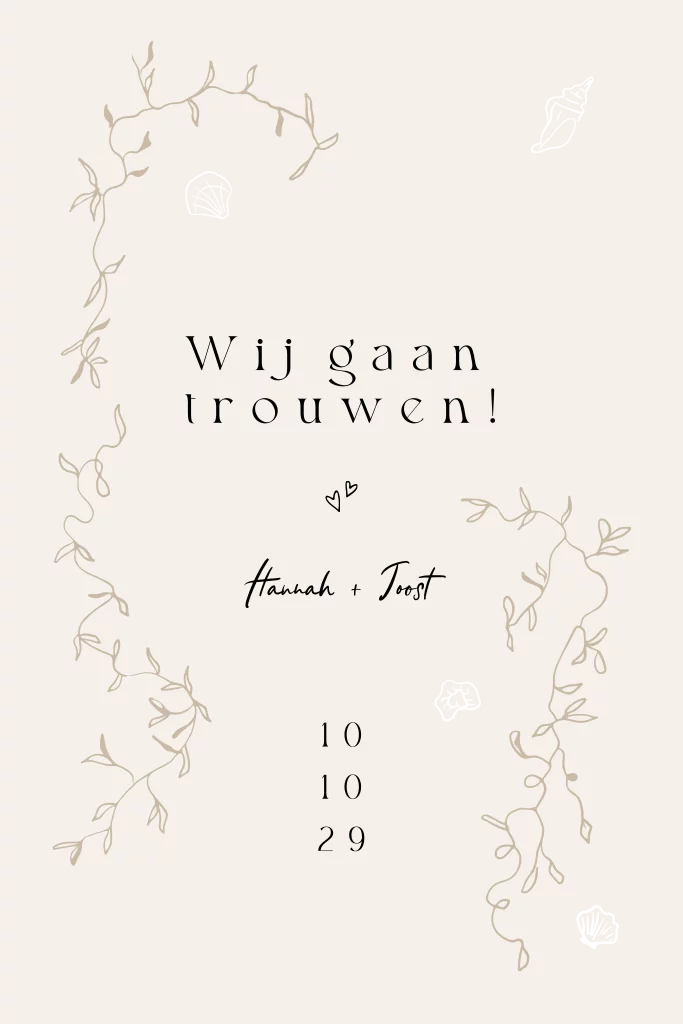 Trouwkaart in beach stijl met zandkleuren en zwart voor een chique effect. Met speelse handgetekende illustraties van schelpjes en zeewier/takjes voor die strandvibe. Kies voor een save-the-date kaart voor de schelpvorm om helemaal in stijl je kaarten te versturen.