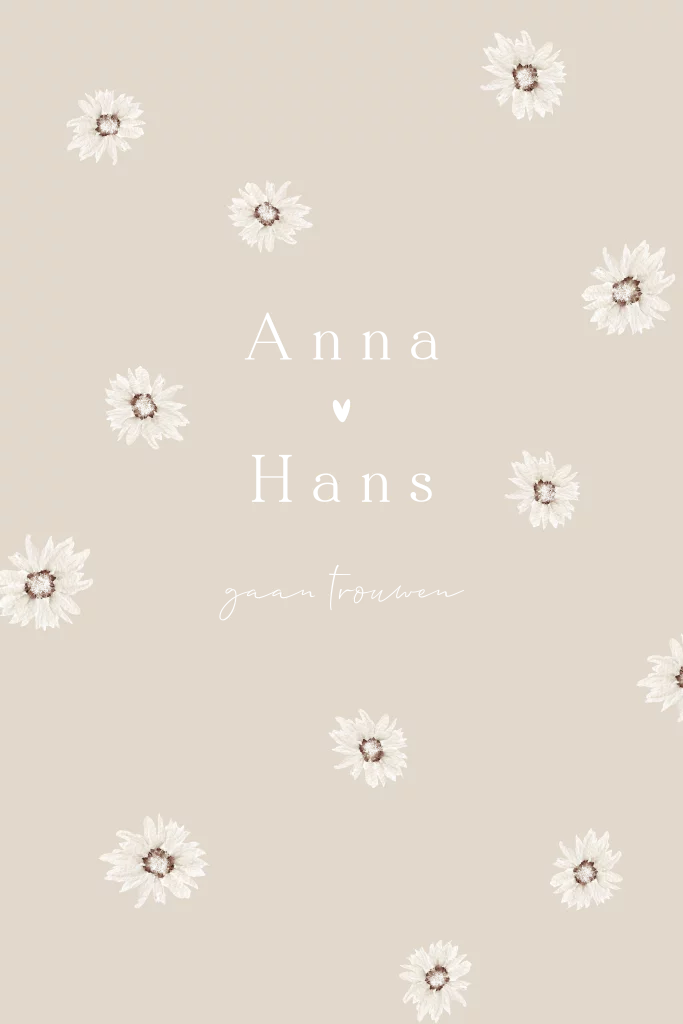 Trouwkaart in beige met witte madeliefjes met goudfolie knopjes. Pas jullie trouwkaart helemaal naar wens en smaak aan in de editor. Mocht je hulp nodig hebben, wij helpen je graag!