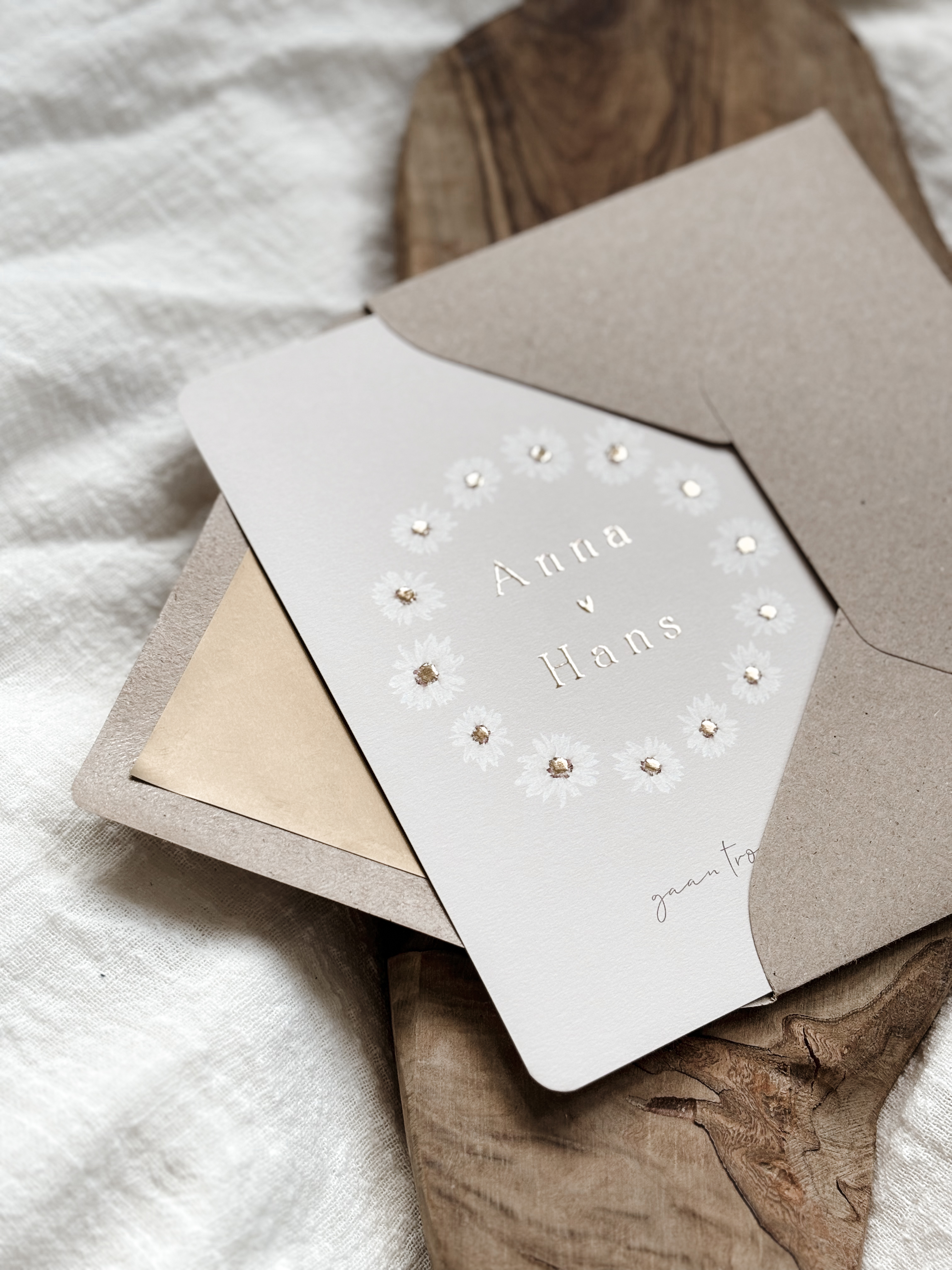 Trouwkaart in beige met witte madeliefjes in een ronde met goudfolie knopjes. Pas jullie trouwkaart helemaal naar wens en smaak aan in de editor. Mocht je hulp nodig hebben, wij helpen je graag!