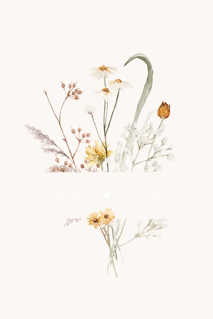 Trouwkaart met een bloemenboeket met veldbloemen en namen in goudfolie. Pas de kleuren en jullie gegevens gemakkelijk aan in de handige editor! Hulp nodig? Wij helpen je graag!