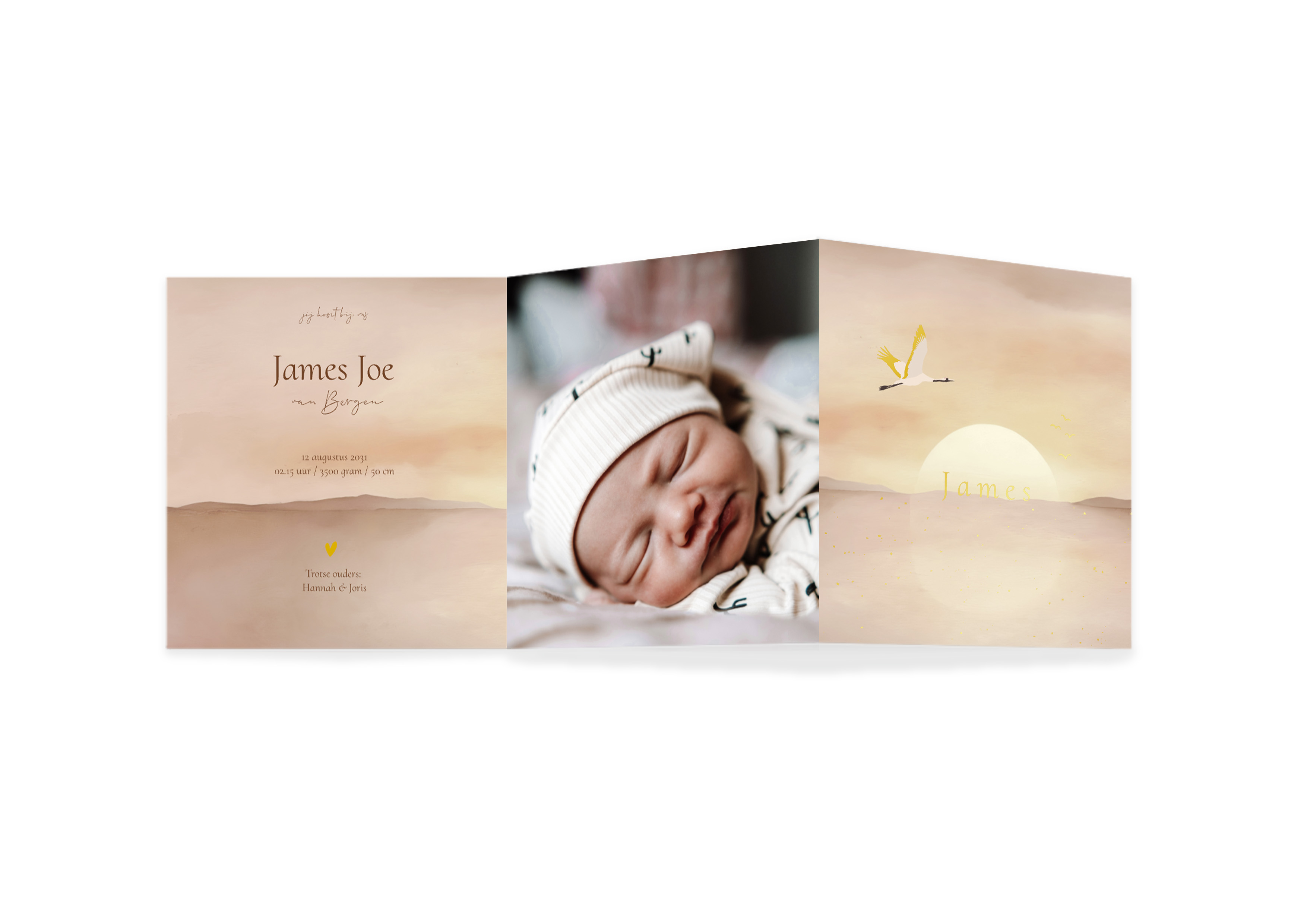 Prachtig geboortekaartje in een zigzag 3-luik (de rechterkant is de voorkant als je het vouwt). Het kaartje heeft een mooie aquarel landschap met ondergaande zon, zee en bergen, waarbij er een kraanvogel in de lucht vliegt. Als mooie details heeft dit kaartje glinstering in de zee wat gedrukt wordt met goudfolie en ook de vleugels van de kraanvogel worden gedrukt in goudfolie.